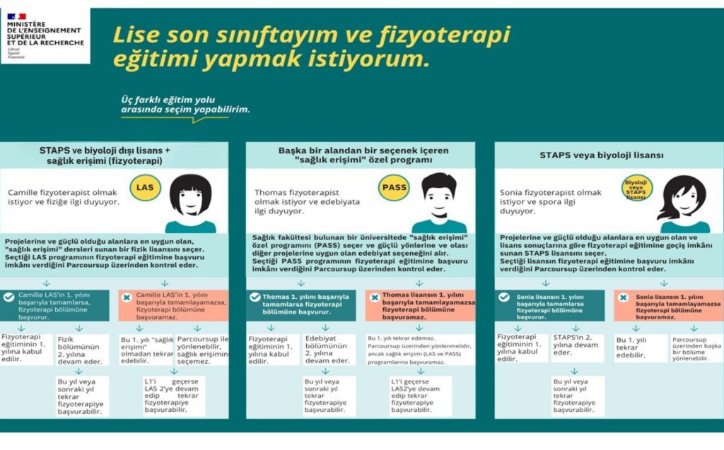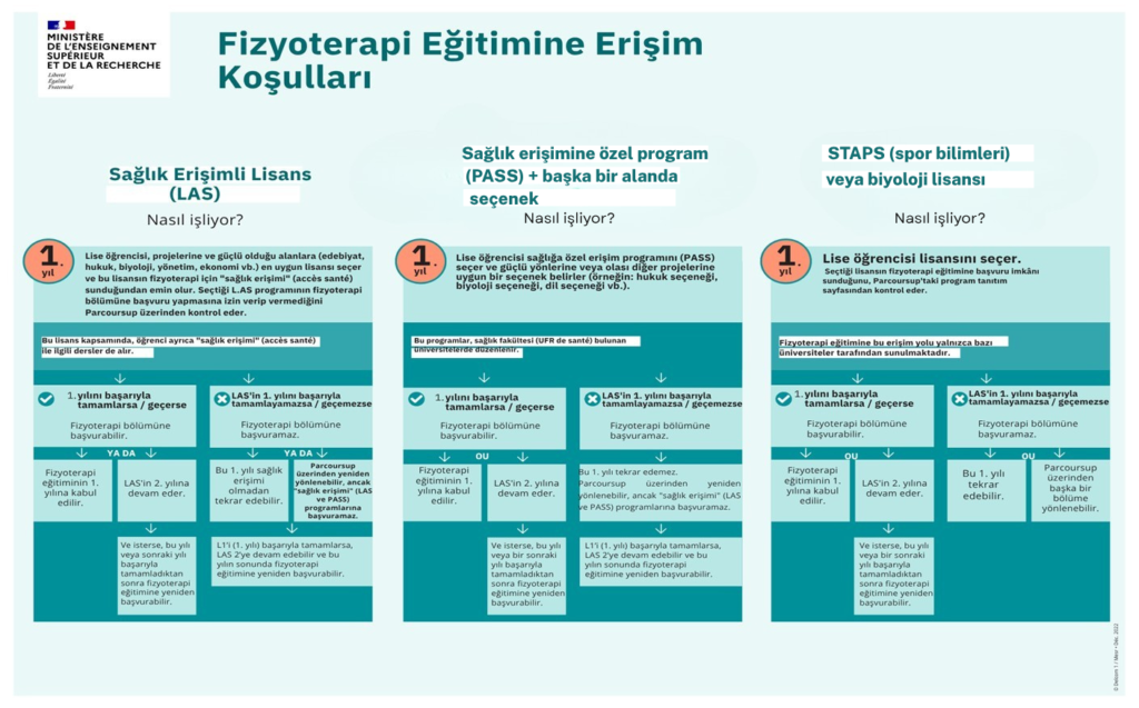 Fransa’da fizyoterapi eğitimine erişim için öğrencilerin üniversitede birinci yıl olarak seçebilecekleri üç temel yol bulunmaktadır. Öğrenciler bu yollardan birini seçerek üniversite eğitimlerine başlar ve birinci yılın sonunda elde ettikleri sonuçlara göre fizyoterapi eğitimine başvuru yaparlar. Bu süreçte öğrencilerin akademik başarıları, motivasyonları ve bazı durumlarda sözlü değerlendirmeler önemli rol oynar.